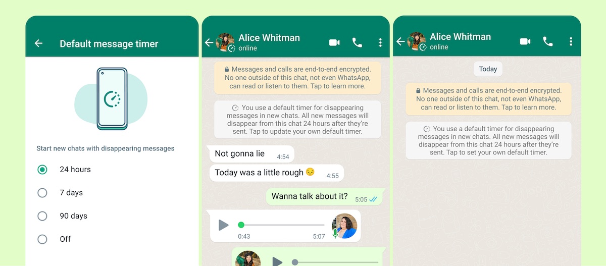 WhatsApp is additionally also giving users the option to have their messages disappear after 24 hours and 90 days, in addition to the seven-day period it originally introduced the feature with last year.