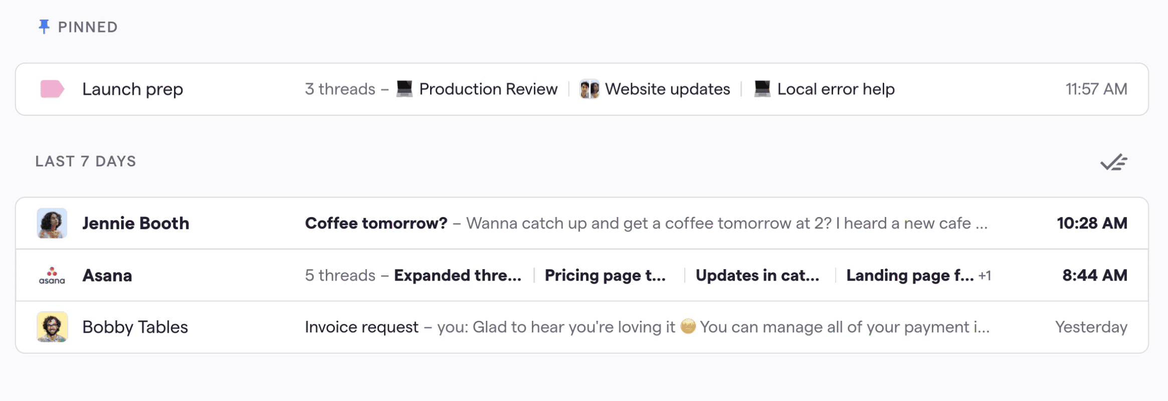 As Lee told me, the team took two important inspirations from Inbox. “One is the idea that you should work with your email in groups,” he said, referring to Inbox’s ability to bundle emails by topic. “As the volume of email grows in your inbox, it becomes impractical just to page through every single email. Even if you have all the keyboard shortcuts and your app is super optimized, just scanning through all that stuff takes a long time.” While you want to know about automated emails like calendar notifications for example, chances are you’ve already accepted those invites in your calendar, for example, so marking all those as read or snooze them for later with a couple of clicks saves a lot of time.