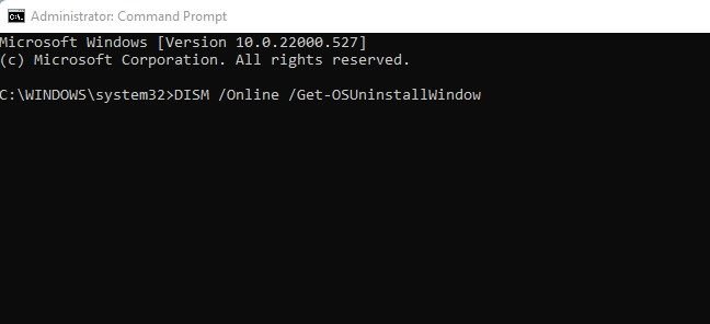 3. On the Command Prompt, enter DISM /Online /Get-OSUninstallWindow. This will show you the current time limit for the rollback.