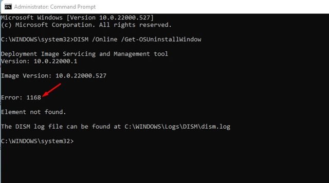 4. If the rollback period is already over, you will see an error message “Error 1168 – Element Not found“.