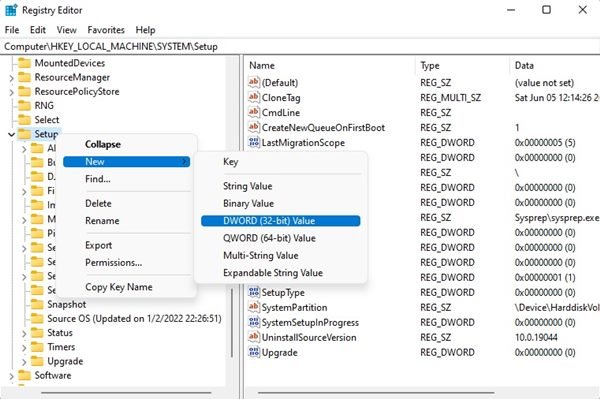 4. Now right click on the Setup key and select New > DWORD (32-bit) Value.