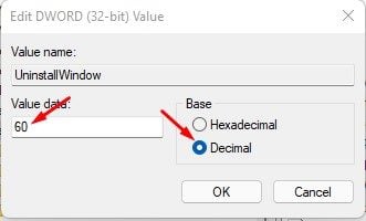 7. Under the Value data field, type 60 if you want to extend the rollback time limit to 60 days. Then, on the Base, select ‘Decimal‘.