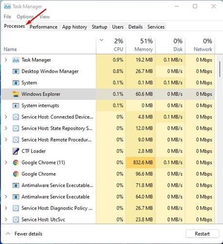 2. On the Task Manager, switch the Processes tab as shown in the screenshot below.