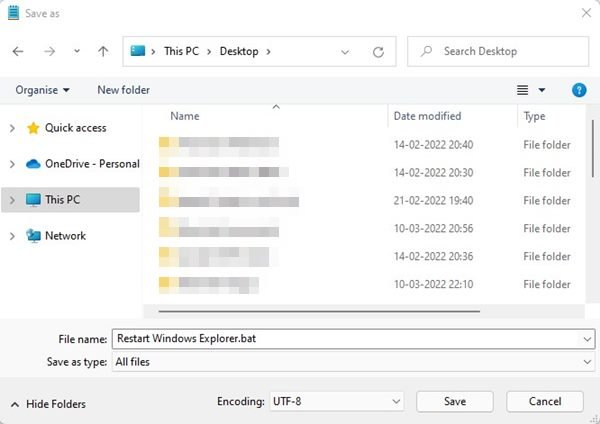 4. In the Save Window, choose your location, and then under the Save as type, select All Files. Next, name the file whatever you want, but make sure the .bat extension follows it. Finally, click on the Save button to save the batch file.