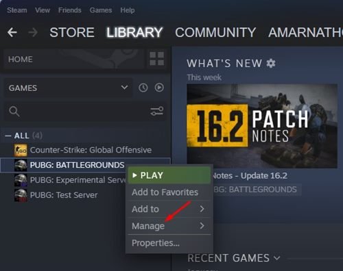 4. Right-click on the game title displayed on the left pane and select the Manage option.