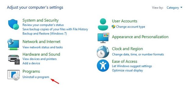 2. On the Control Panel, click on the Uninstall a program option under the Programs.