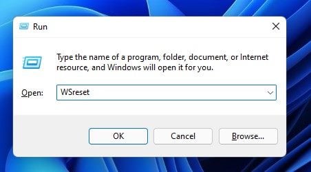 2. On the RUN dialog box, type in WSReset and hit the Enter button.