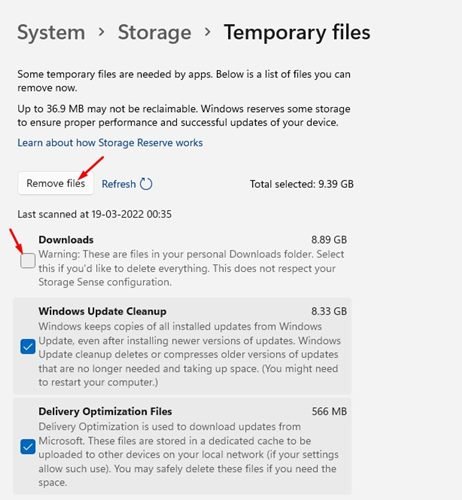 5. On the Temporary files page, just uncheck the Downloads option and click on the Remove files button.