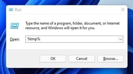 2. On the RUN dialog box, type in %tmp% and press the Enter button.