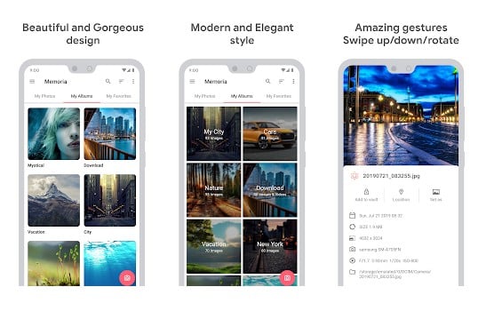 The app has a gorgeous material design which makes it fast and smooth. With Memoria Photo Gallery, you can easily manage your photos and create albums.