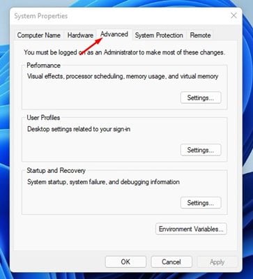 2. On the System Properties popup, switch to the Advanced tab as shown below.