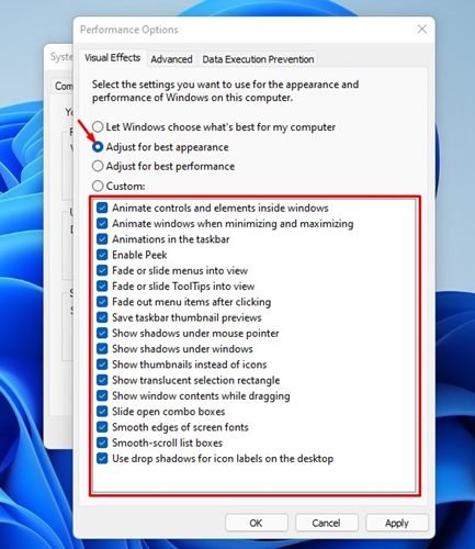 4. On the Performance option, you need to select the ‘Adjust for best performance’ option.