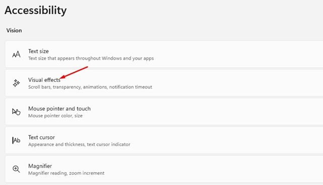 3. On the right pane, scroll down and click on the Visual effects.