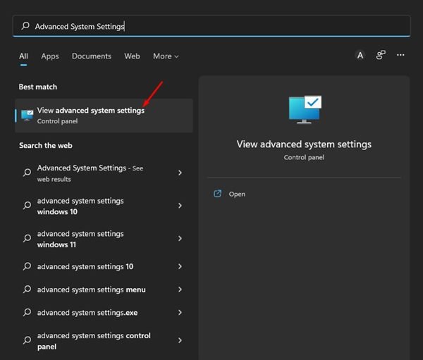 1. First of all, click on the Windows 11 search and type in Advanced System Settings. Next, open the View Advanced System Settings option from the list.