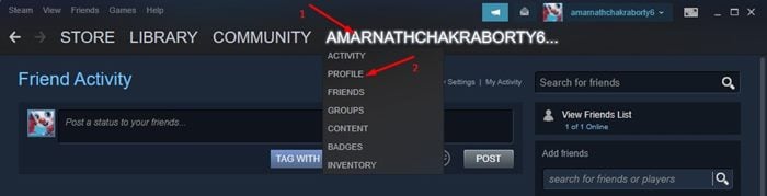2. On the Steam client, click on your Steam username and click on the Profile option as shown below.