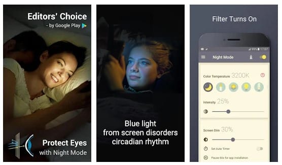 The app effectively filters out the blue light emitted from the smartphone screen. Also, it lets you reduce the screen brightness to lower than what you achieve with the default settings.
