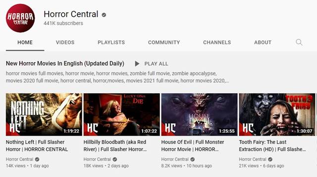 If you are a huge fan of the Horror genre, you might prefer subscribing to the Horror Central YouTube channel. Just like the Movie Central, Horror Central has movies that you can watch for free without worrying about breaking any law,