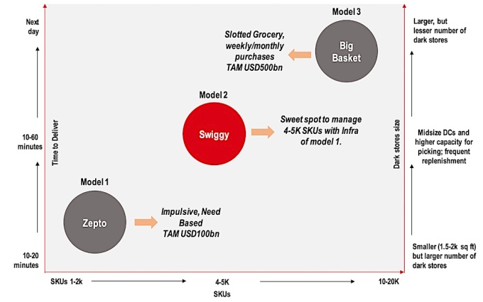 “There are broadly three models of grocery delivery business. On one extreme is quick-commerce (10-15-minute delivery), with highly constrained SKUs (1-2K) and on the other extreme is a full kitchen offering (delivery next day) with 25-30K SKUs. The former are ‘instinctive’ purchases, while the latter are planned. Theoretically, instinctive purchases are less discount-driven and more need-driven, while planned are more discount- and assortment-driven. Somewhere in the middle are 4-5K SKUs, which cater to both ends with certain benefits and compromises for both instinctive buyers and planned buyers,” they explained.