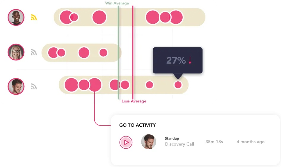 By integrating into a company’s broader tech stack, including calendars, CRMs, dialers, and video conferencing tools, Jiminny can provide insights such as which personnel are most successful at converting that initial “discovery call” into a serious prospect (or even a sale), and dive directly into the call that made it happen.