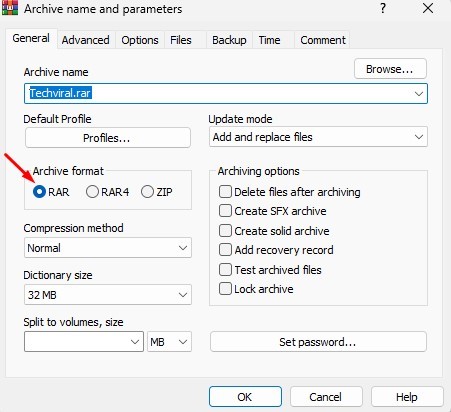 3. Now, on the archive name and parameters window, select ‘RAR‘ on the Archive format.