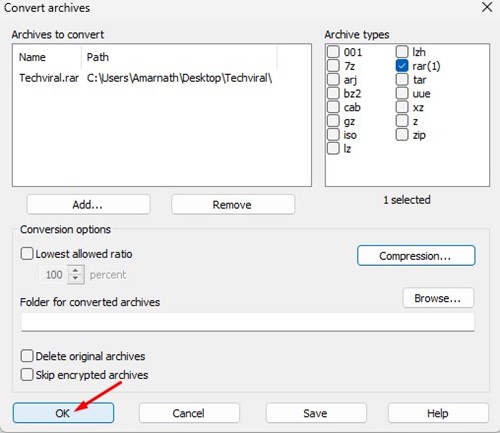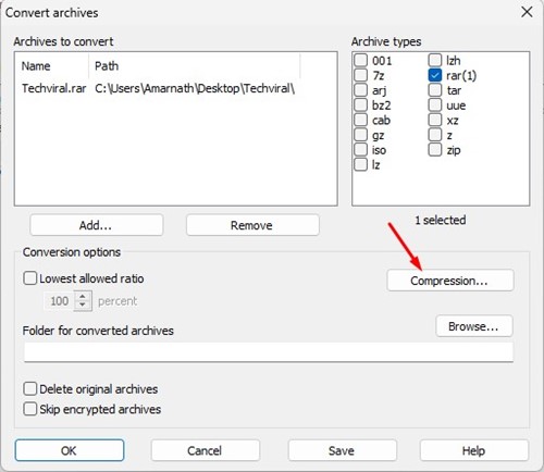 3. On the Convert Archive prompt, click the Compression button in the Conversion options section.