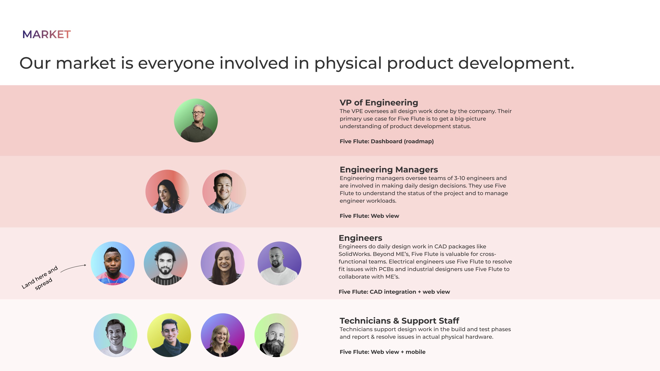 The needs of technical, repair and support staff (who often do the testing and customer-facing operations), engineering manager teams (who have a less detailed but more strategic view), and other aspects of the business are all different. On this slide, Five Flute is effectively mapping out how it is planning to make itself indispensable across the whole product org. The slide helps position the company in the org chart in a way that is easy to explain and shows its ultimate ambition really well, too.
