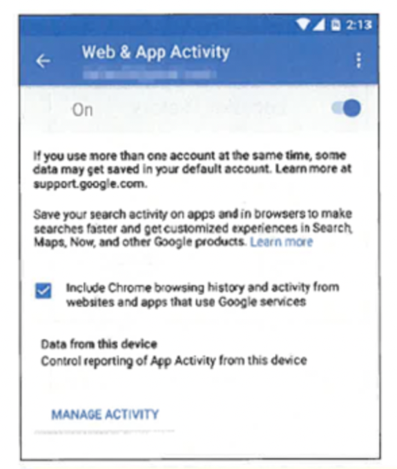 Airgapped below, towards the very bottom of the screen, is a hyperlinked option to “MANAGE ACTIVITY”. This text is bolder — being in ALL CAPS. So does draw the eye. Yet what even is this? Why does the user have to wade into fresh Google submenu hell to try to turn off tracking, as this option seems to be implying? Surely they can just toggle the ‘on’ switch at the top of the settings screen to do that…