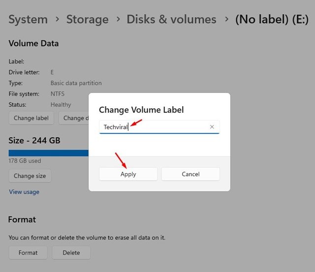 8. Now, type the new volume label and click the Apply button.