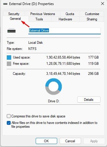 3. On the Drive Properties, switch to the General tab.