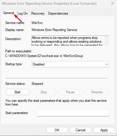 3. On the Windows Error Reporting Service Properties, switch to the General tab.General