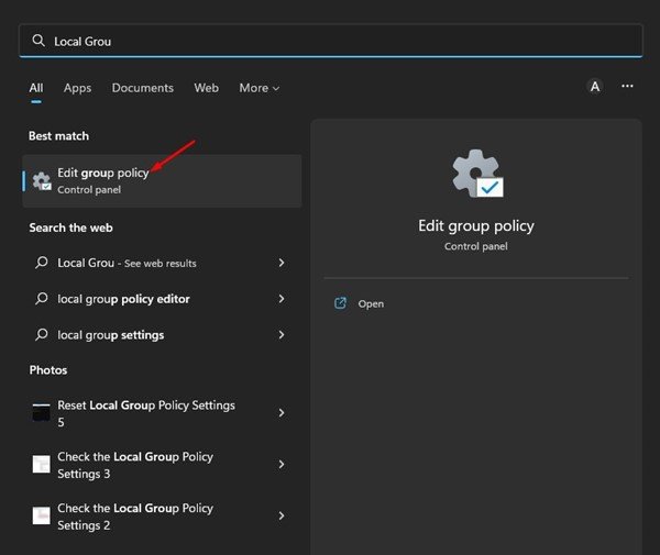 1. First, click on the Windows 11 search and type in Local Group Policy Editor. Next, open the Local Group Policy Editor app from the list of matching results.Local Group Policy Editor