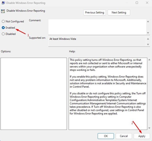 4. On the Disable Windows Error Reporting policy, select Enabled and click on the Apply button.