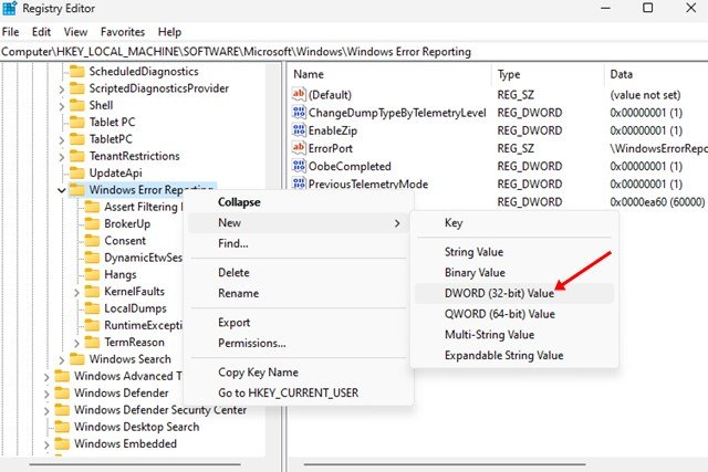 3. Right-click on the Windows Error Reporting and select New > DWORD (32-bit) Value.New > DWORD (32-bit) Value