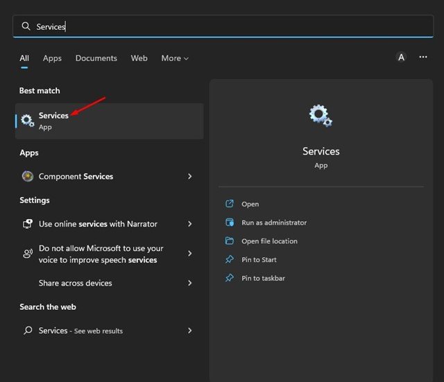 1. Click on the Windows 11 search and type in Services. Next, open the Services app from the list of matching results.open the Services app