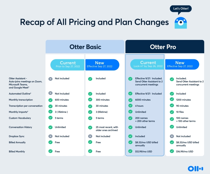 But that’s not all. Otter Pro’s monthly subscribers will have to pay $16.99 per month instead of $12.99 starting September 27, though they will get to use their accounts with the current limits until November 30. The annual plan will still cost $99.99 ($8.33 per month), so if users subscribe to that plan before September 27, current feature limits will apply until next year.
