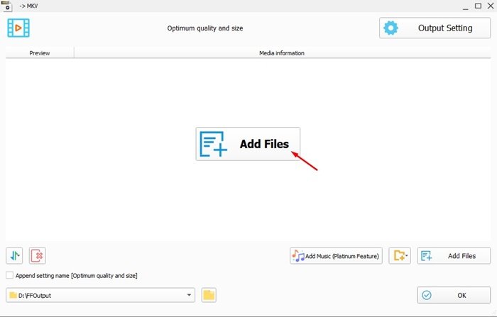 3. On the Window that appears, click the Add Files button and select the MP4 file you want to convert. Once done, click on the Ok button.