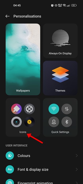3. On the Personalisations, tap on the Icons.