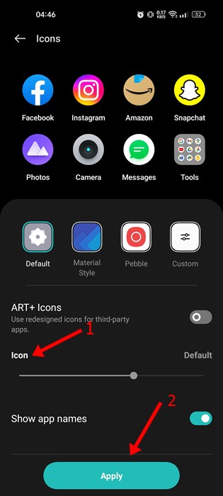 4. Now, use the slider underneath the icon to adjust the icon size. Once done, tap on the Apply button.