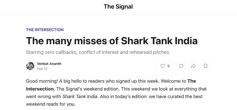 Signal says it is aiming to serve savvy audiences in India and beyond. It has amassed over 38,000 subscribers, a base that includes several unicorn founders, lawmakers and policy executives. Its newsletter goes out at 8 AM and requires just five to seven minutes of reader time, said Narayanan.