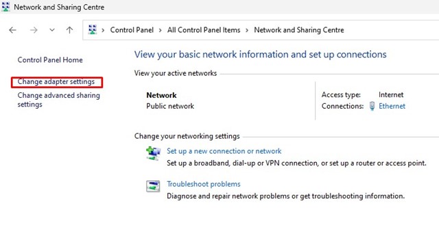 2. On the Network and Sharing Center screen, click on Change adapter settings.