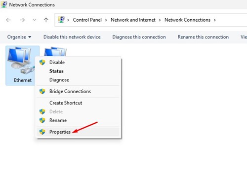 3. Now, you will see all networks; select the network you want to configure for Google DNS. If you want to change ethernet settings, right-click on Local Area Connection and select Properties.