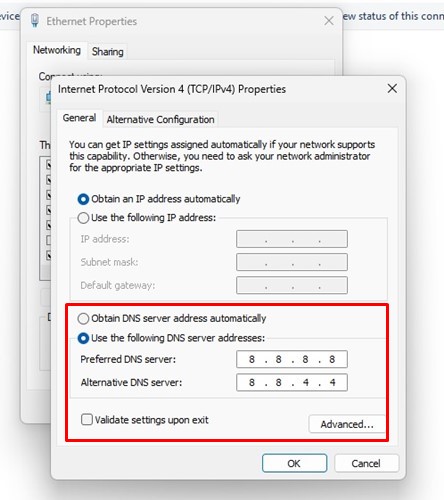 5. Now, choose the radio button for Use the following DNS server addresses. Now, on the Preferred DNS server field, enter 8.8.8.8, and on the Alternative DNS, enter 8.8.4.4. Once done, click on the Ok button.
