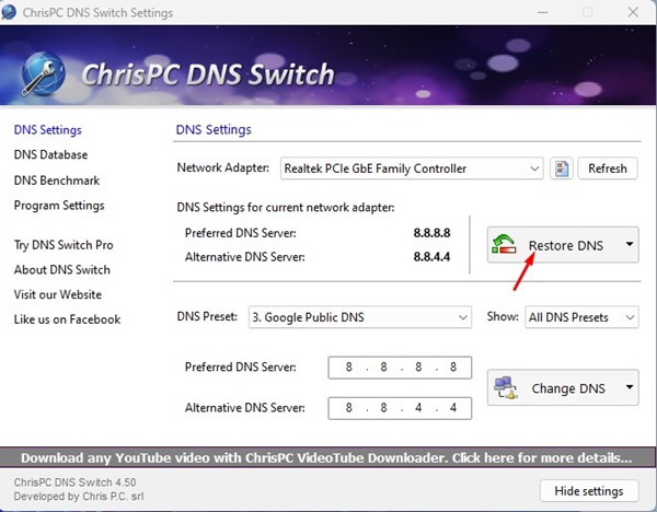 5. Now, if you need to restore previous DNS settings, you need to click on “Restore DNS“, On the pop-up, you need to hit the “Yes” button.