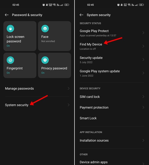 2. On the Password & Security screen, tap on System Security. On the System Security, tap on the Find My Device option.