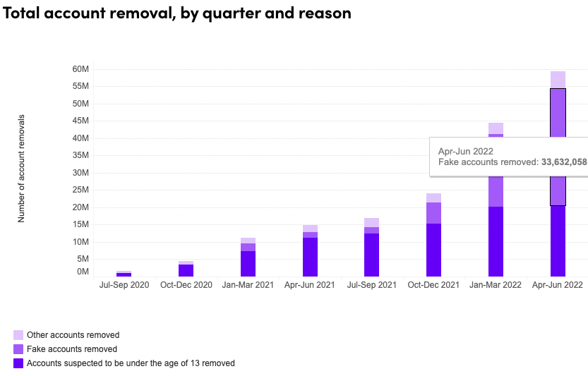 Covering the period from April 1 to June 30 this year, the report spans a wide gamut of self-reported data points around video and account takedowns, arguably most notable among them relating to that of fake accounts. TikTok reports that it removed 33.6 million fake accounts for the quarter, representing a 61% increase on the 20.8 million accounts it removed in the previous quarter. Looking further back to the corresponding second quarter last year shows that TikTok fake account removal rate has grown by more than 2,000% over 12 months.