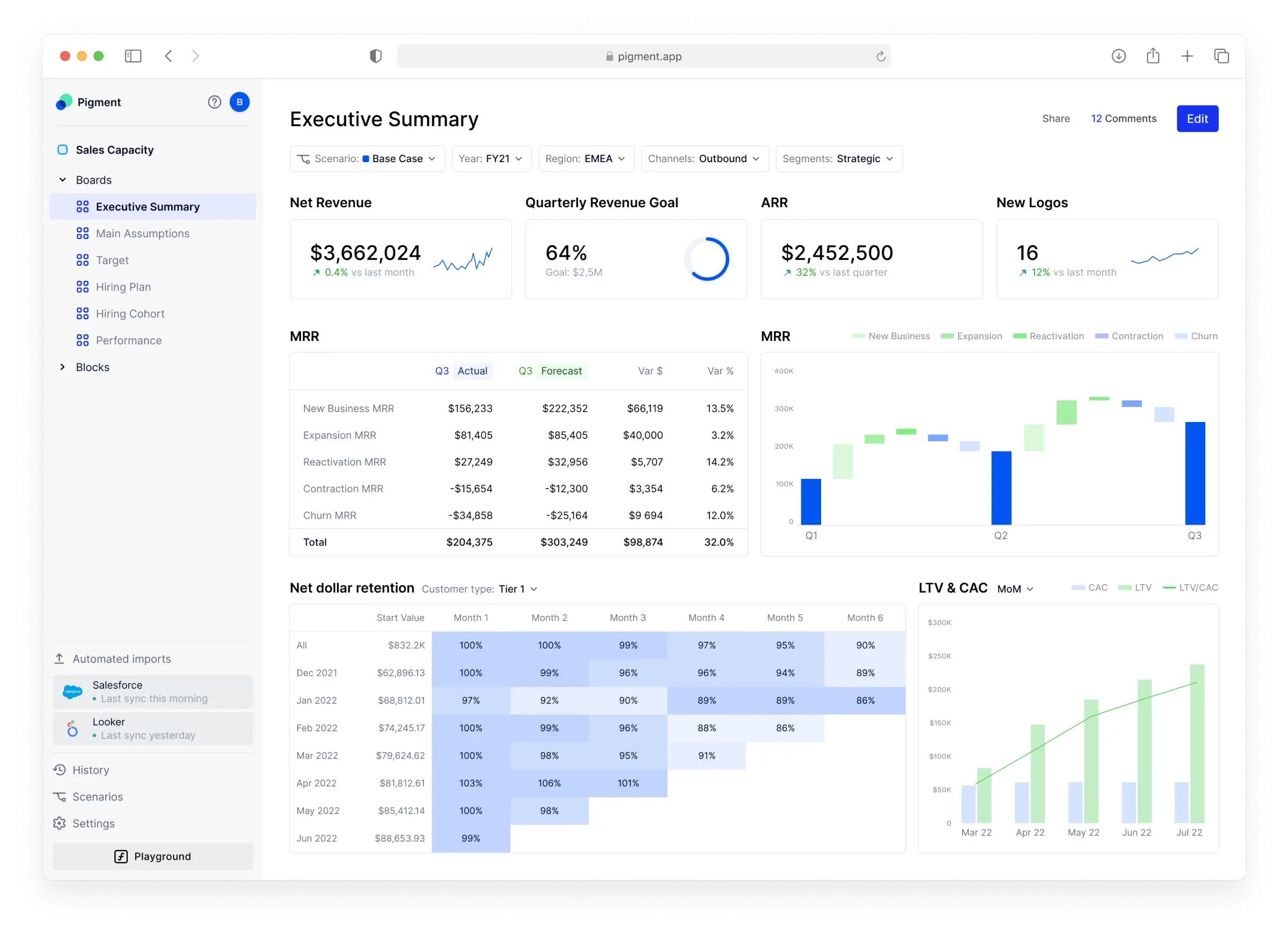 Pigment connects with the tools that your teams already use, such as Salesforce, NetSuite, Workday and Snowflake. Clients use the platform to import, clean and enrich data from those other products. Once the data is in, you don’t have to enter the same number in multiple sheets as you can automatically reflect your metrics across the board. Pigment supports Excel-like formulas as well.