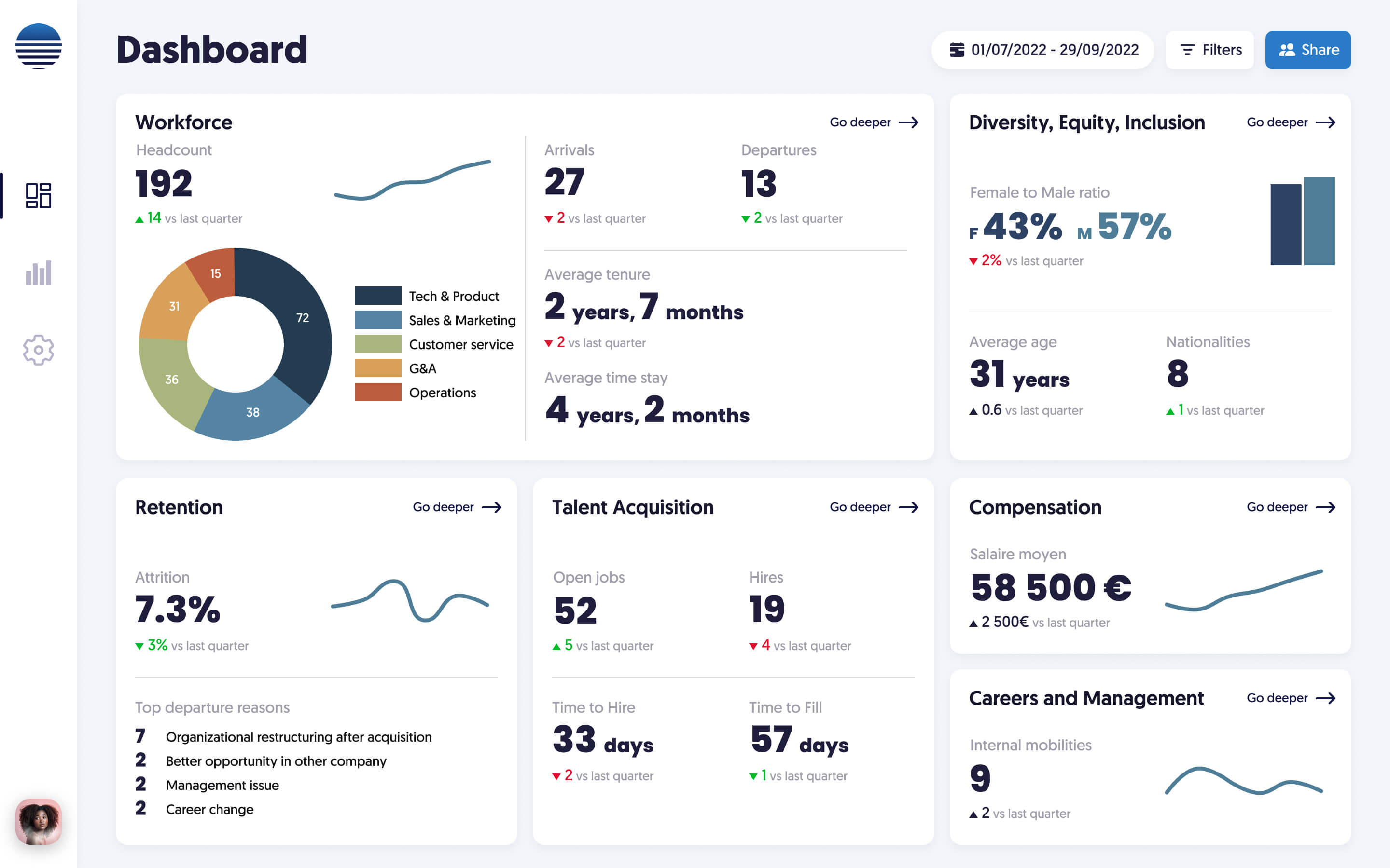 After that, Reflect acts as a single repository for all HR metrics. Users can then select data points and track progress. For instance, companies use Reflect to track the total headcount in each department, attrition, the number of salary increases per quarter, the proportion of women in leadership positions, etc.