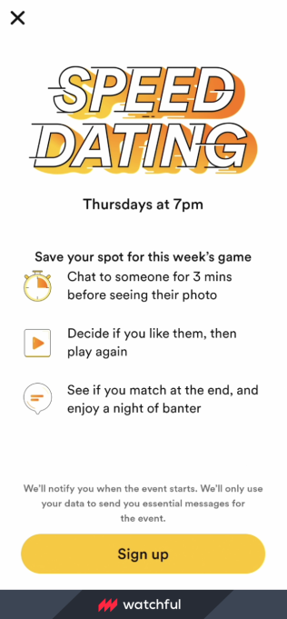 According to data from product intelligence firm Watchful, Bumble has been offering speed dating on Thursdays at 7 PM in the U.K. However, according to some posts by users on social media, the service didn’t always have enough users to get the game started. Others who tried it had positive things to say about the experience, however.