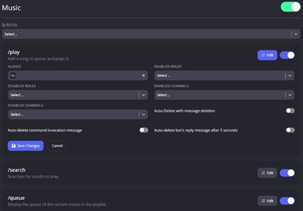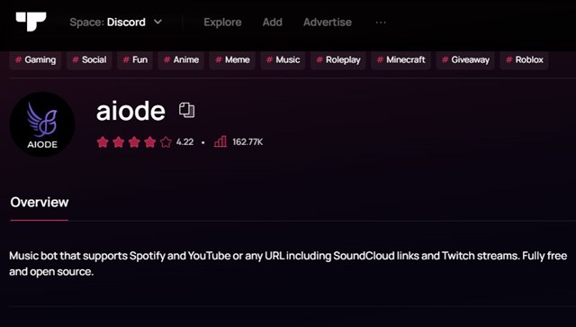 Some other features of Aiode include adjustable bot properties, managing roles for accessing the bot commands, the ability to create own player commands, and more.