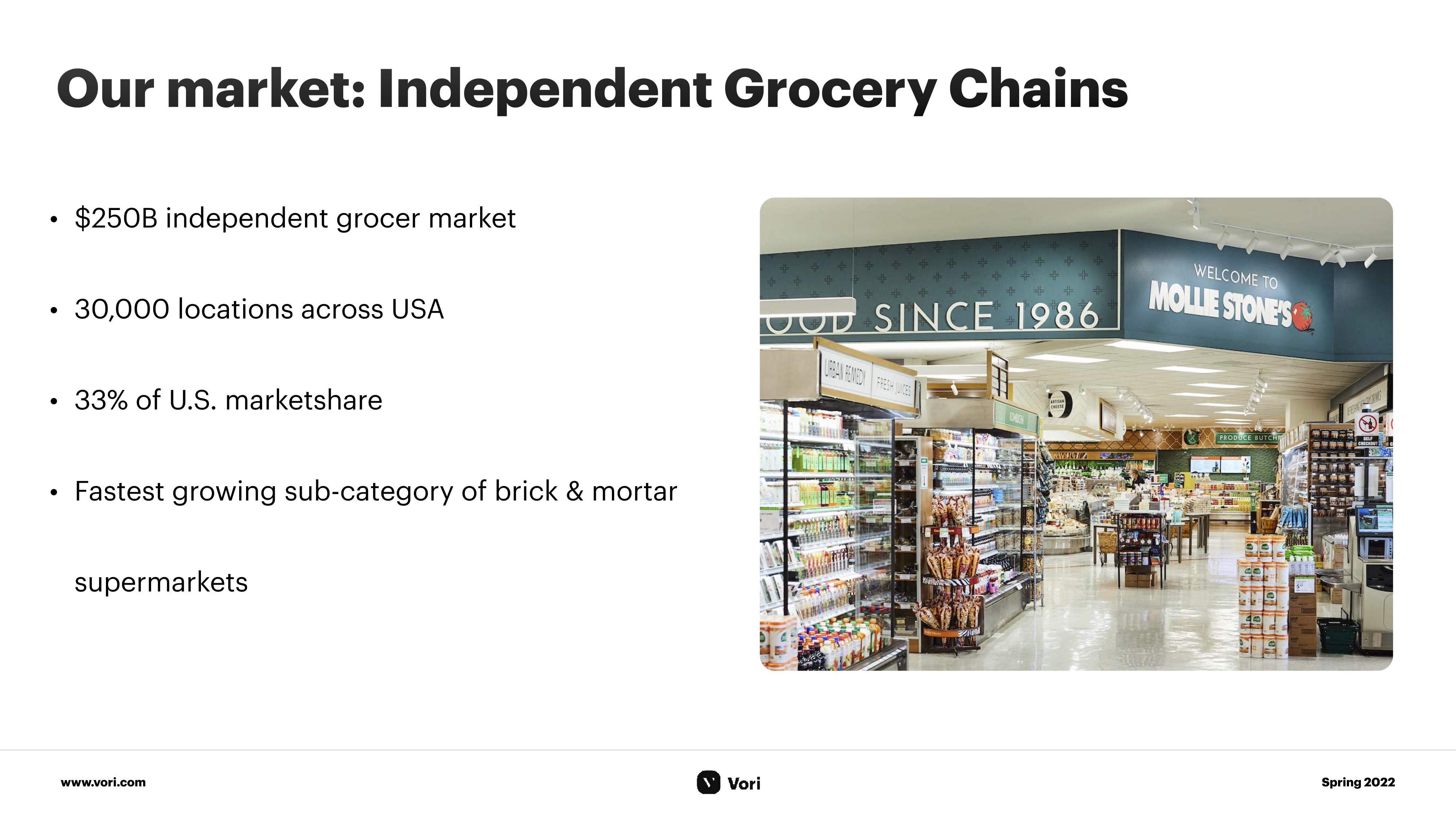 I wouldn’t at all be surprised if the first question a VC asks themselves would be “Well, cool, but how many independent stores are there?” or, “How big is this market?” or, “If there is a market, is it collapsing under the weight of supermarket chain roll-ups, or is it growing?” Vori does an exceptional job at painting a picture of a market that is robust, thriving, growing and worth addressing. Now, I’d need to perform due diligence on that. (The first Google result seems to confirm that indies have a third of the market share and are worth around $250 billion but seems to suggest there are only 21,000 locations, so I’d want to dig into the data source and the discrepancies here).